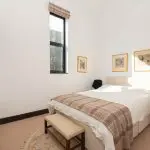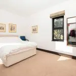 A dual-aspect double bedroom with excellent natural light from full-height windows with top-hung casements to both sides. The room is finished with a cut-pile carpet and white-painted walls. Recessed ceiling spotlights provide artificial lighting.