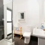 Fitted with a three-piece suite comprising a shower cubicle with large-format ceramic tiling, a close-coupled WC and a pedestal wash-hand basin with mixer tap. The shower is finished with chrome fittings including both a handset and a fixed rose. Walls are finished in a neutral scheme, complemented by polished ceramic floor tiling. Natural light is provided by a full-height, top-hung window to the side aspect, with recessed ceiling spotlights and mechanical extraction ventilation.