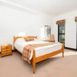 A further double bedroom positioned to the central left-hand side of the property, with a vaulted ceiling enhancing the sense of space. The room is finished with cut-pile carpeting and white-painted walls. Built-in storage is provided by a large sliding mirrored wardrobe with shelving and hanging rails.