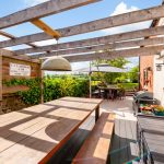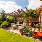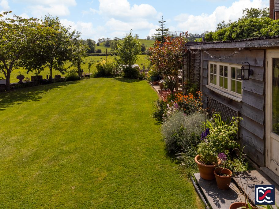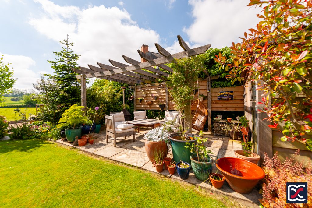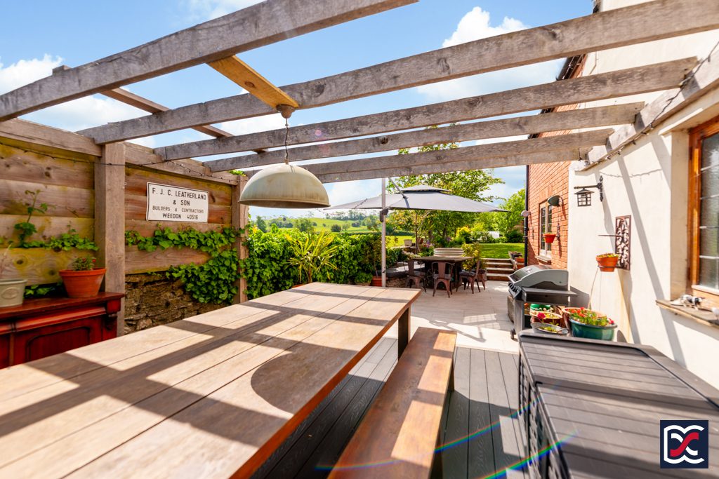 A limestone patio and reclaimed brick pathway extend the full width of the property, with a mix of drystone and brick retaining walls enclosing the raised central lawn. The patio continues to the side of the property, where a raised decking area and an oak pergola create an ideal space for entertaining and alfresco dining. Another oak pergola on the right-hand side of the garden provides shelter above a patio with space for a table and chairs. Traditional pendant lights enhance the ambiance, making it perfect for evening gatherings.