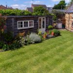 Additional storage is provided by an adjacent timber structure with a mono-pitch roof and double swing oak doors.