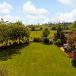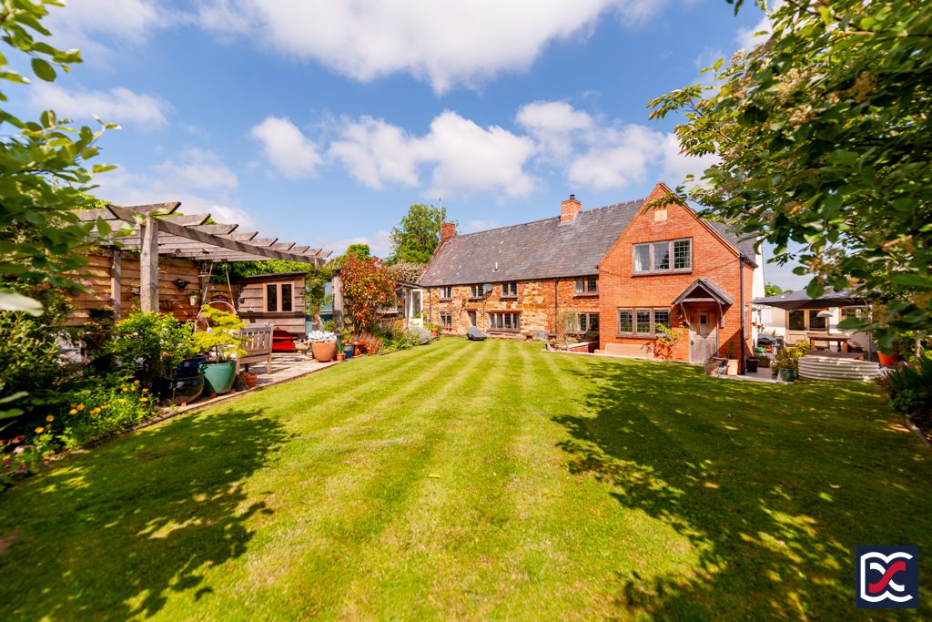 The rear gardens are beautifully maintained, featuring striped lawns and established perimeter shrubs and plants. A low-level brick and stone boundary wall backs onto adjacent farmland, offering far-reaching views towards Weedon Round Hill—a local landmark known for its scenic vistas and a popular sledging spot in the snow.