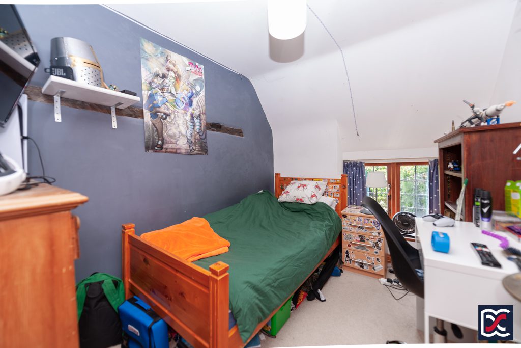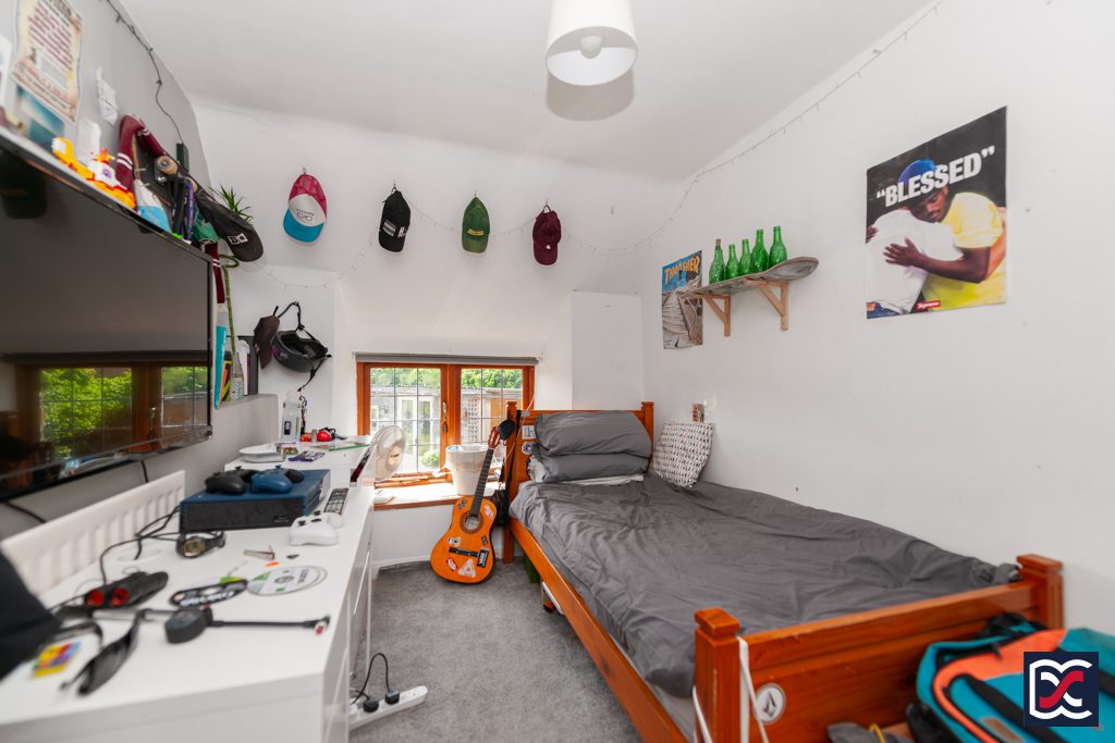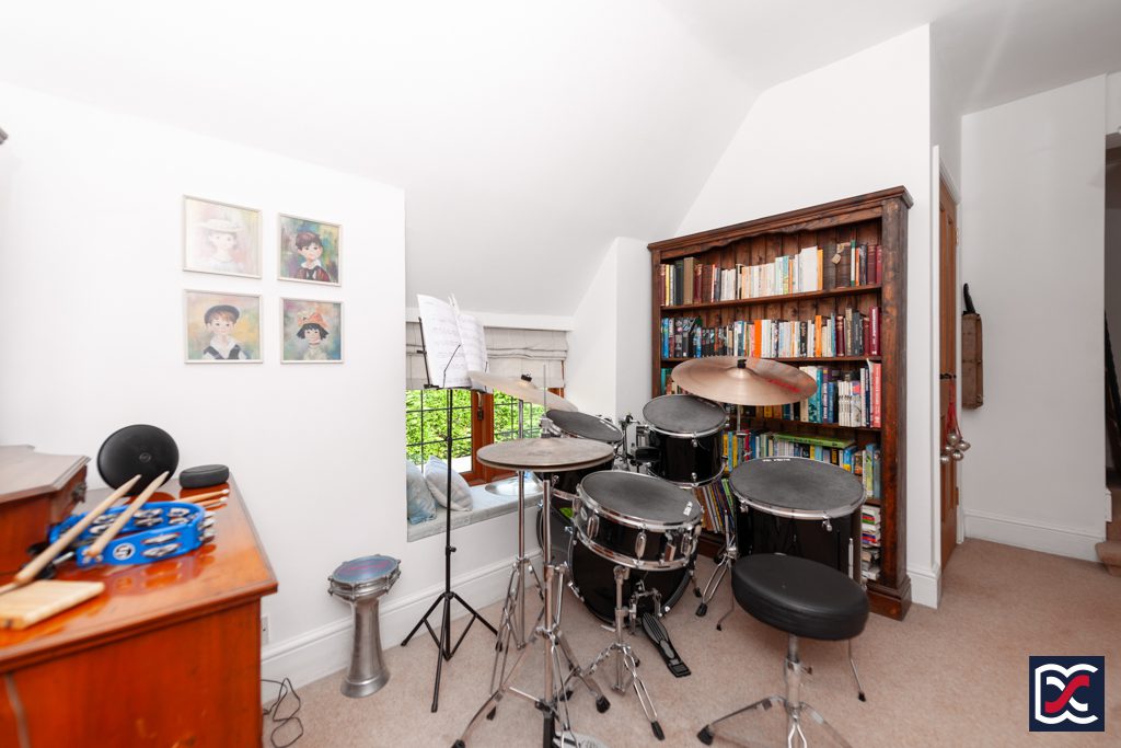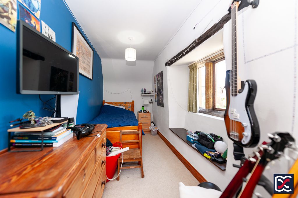 Bedrooms four and five were formerly a large double bedroom, but the current vendor has installed a timber stud partition to create two single bedrooms. Bedroom four is a single bedroom with a part-vaulted ceiling and leaded light window to the rear elevation. Floors are finished with cut pile carpet.