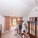 A spacious galleried landing located at the front aspect of the property, featuring an oak handrail and chamfered balustrading. The floors are finished with cut pile carpet, and slatted, ledged, and braced timber doors with Suffolk latches provide access to the bedrooms and family bathroom. Natural light is provided by two leaded light oak windows on the front aspect, and there are several built-in cupboards offering ample storage space.