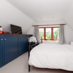A double bedroom located to the left-hand side of the property within the new extension and benefiting from beautiful countryside views from a three-unit gable window. The floors are finished with cut pile carpet, and the part-vaulted ceilings are neutrally decorated and fitted with recessed spotlights. Ample storage is provided by low-level eaves cupboards, and a four-panel door opens to a full-height wardrobe with a clothes rail.