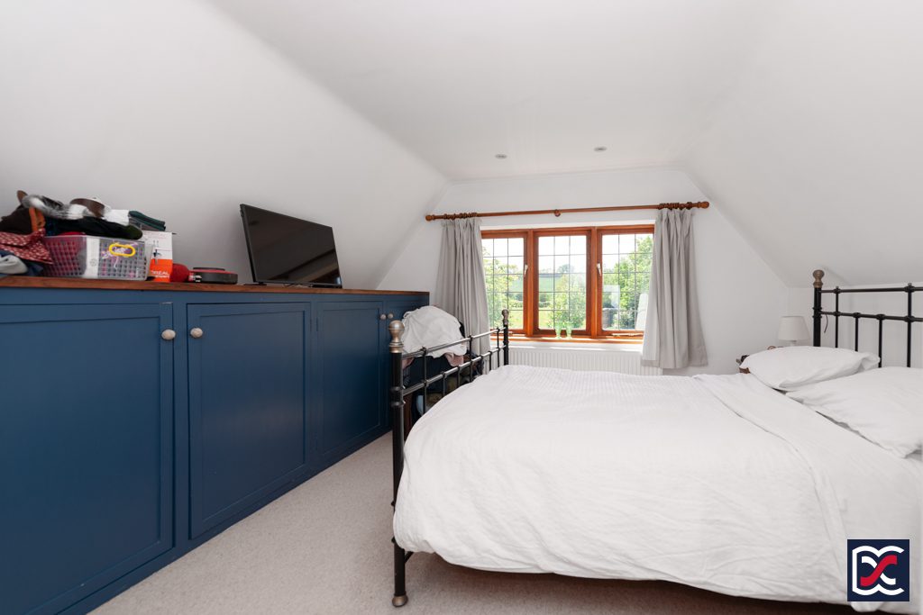 A centrally located double bedroom featuring a three-unit leaded light window with charming views of the south-facing rear garden and the fields beyond. The part-vaulted walls and ceilings are neutrally decorated, while the floors are finished with cut pile carpet.