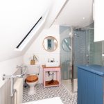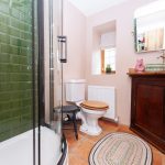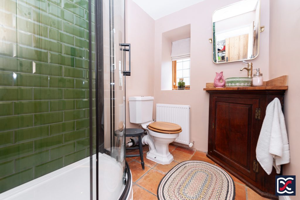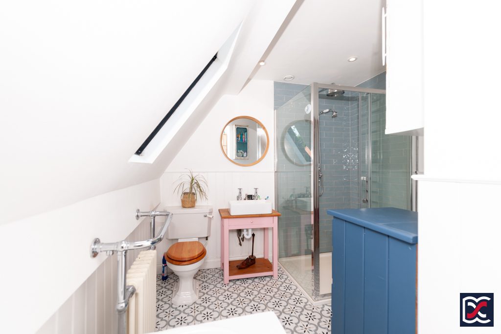 Fitted with a four-piece suite comprising a double-ended bath with chrome pillar taps, a traditionally styled close-coupled WC, a large shower cubicle with a glazed screen and rainfall shower rose, and a contemporary ceramic wash hand basin with chrome pillar taps sitting atop a reclaimed vanity unit. Floors are finished with geometric floor tiles, and natural lighting is provided by a hinged skylight in the part-vaulted ceiling. Heating is by way of a chrome ladder towel rail.