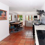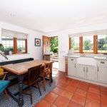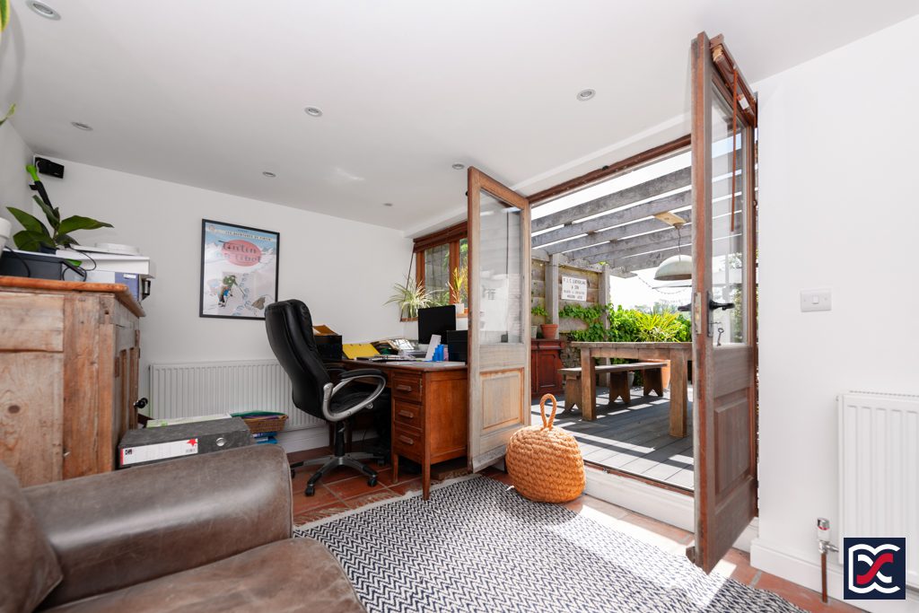 Located to the rear left-hand side of the property, this well-proportioned space features a quarry tile floor and part-glazed double swing doors that open to the patio and side garden, allowing for seamless indoor-outdoor flow. Additional natural light is provided by a leaded light casement window, creating a bright and inviting atmosphere.