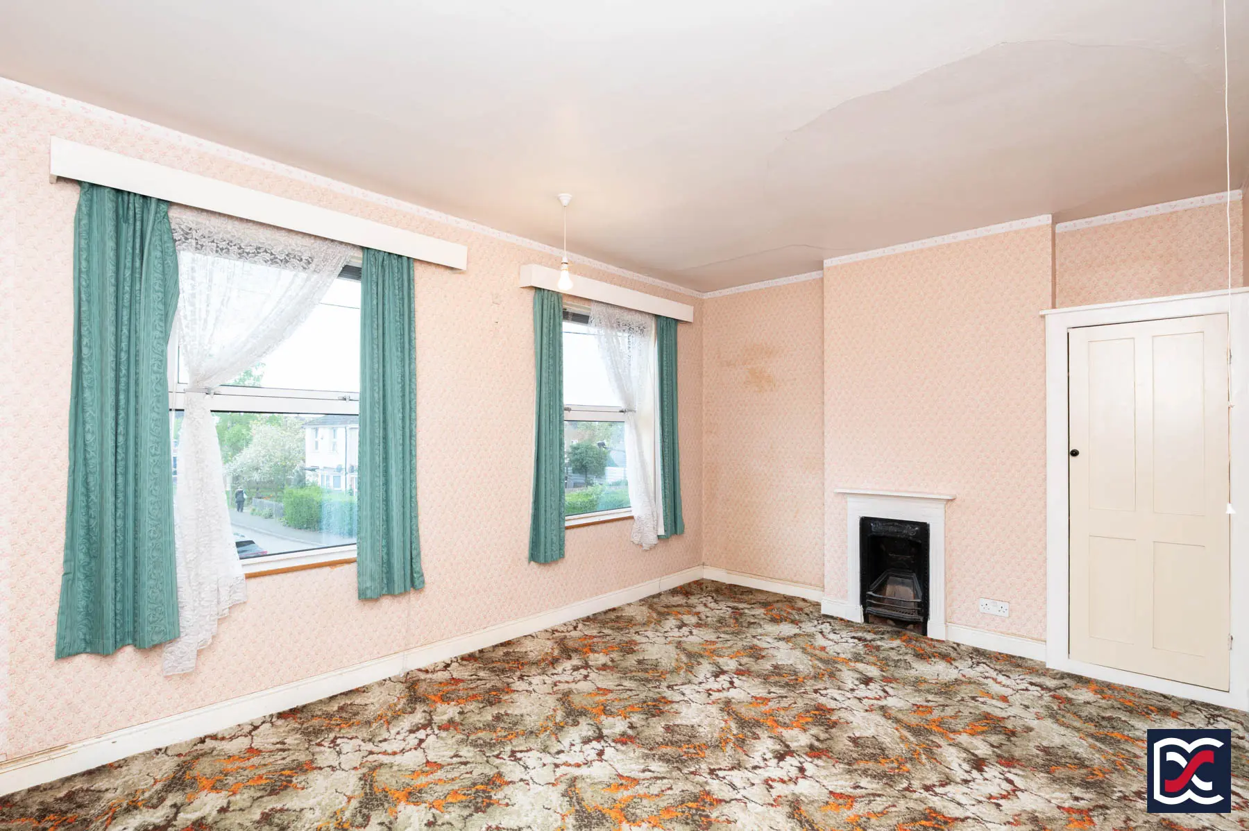 A well-proportioned double bedroom with two large top-hung casement windows to the front aspect, providing good natural light. The room also benefits from a traditional built-in cupboard with four-panel door and fitted shelving. An original decorative cast iron fireplace and surround remains in situ, adding period character.