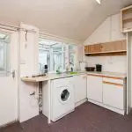 Located to the rear of the property and accessed via the kitchen, the utility room has part-vaulted ceilings and is fitted with base units together with a stainless steel sink and drainer set beneath a large timber casement window overlooking the side aspect. There is space for a washing machine, and a part-glazed door opens to the adjoining lean-to structure. The floor is finished in carpet tiles.
