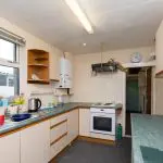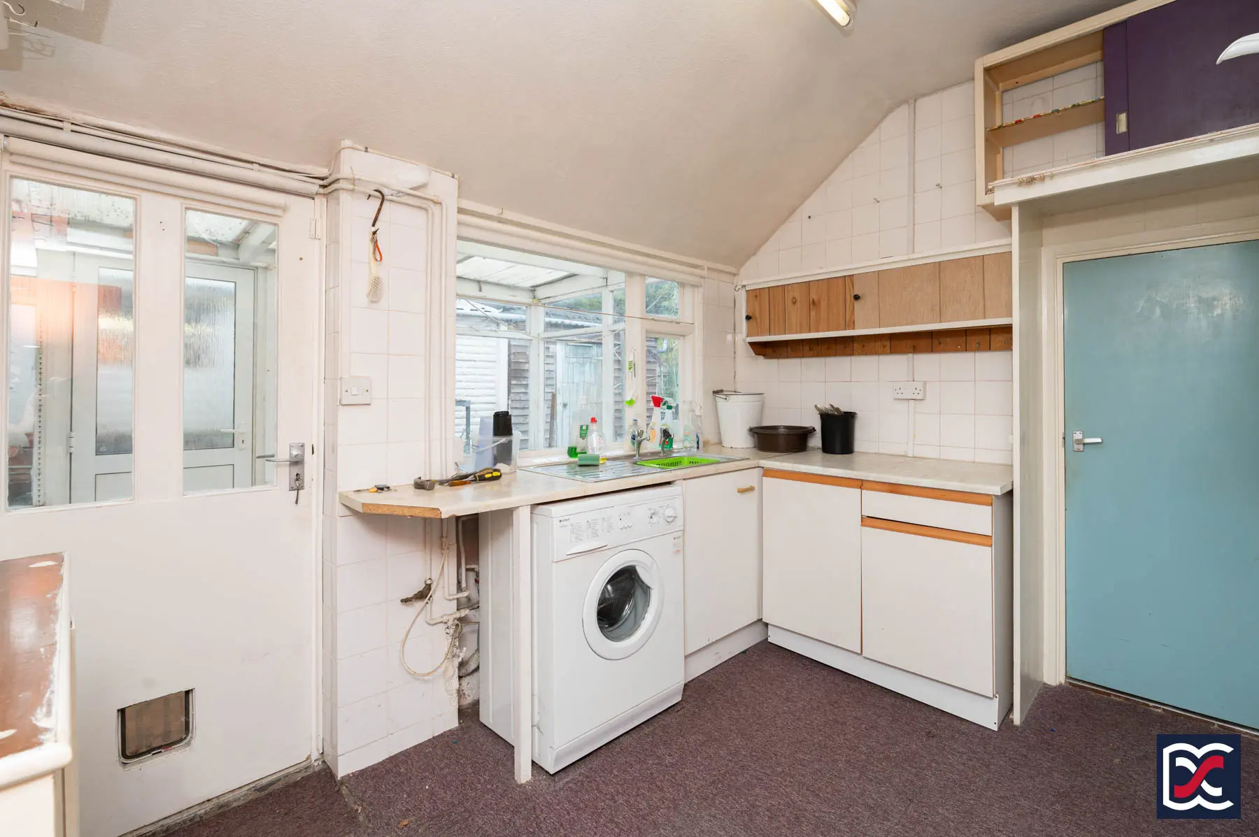 Located to the rear of the property, the dining room features a 1950s tiled fireplace with fitted electric fire (not tested) and a built-in timber storage unit to one side. A top-hung casement window to the rear provides borrowed light from the link structure and gives an outlook towards the rear garden. Doors lead through to both the kitchen and the entrance hall.