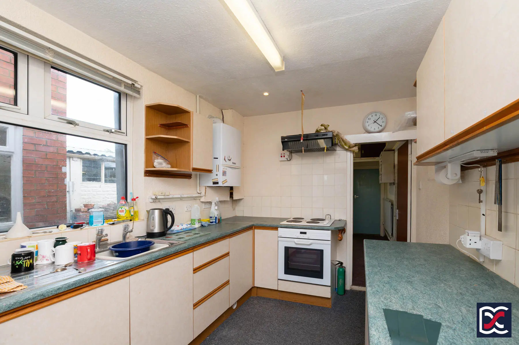 The kitchen is fitted with a base and wall units with a stainless steel sink and drainer set beneath a top-hung casement window overlooking the side aspect. There is a built-in four-burner hob, electric oven and extractor hood above.