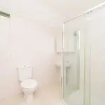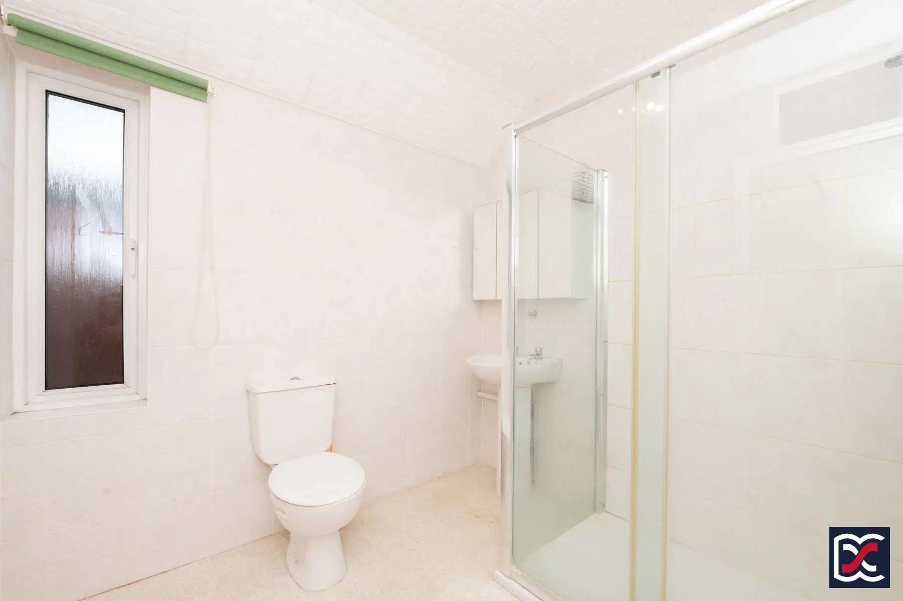 The shower room is fitted with a double-width shower cubicle, pedestal wash hand basin with chrome pillar taps and a close-coupled WC. The part-vaulted ceiling is lined with polystyrene tiles.