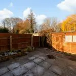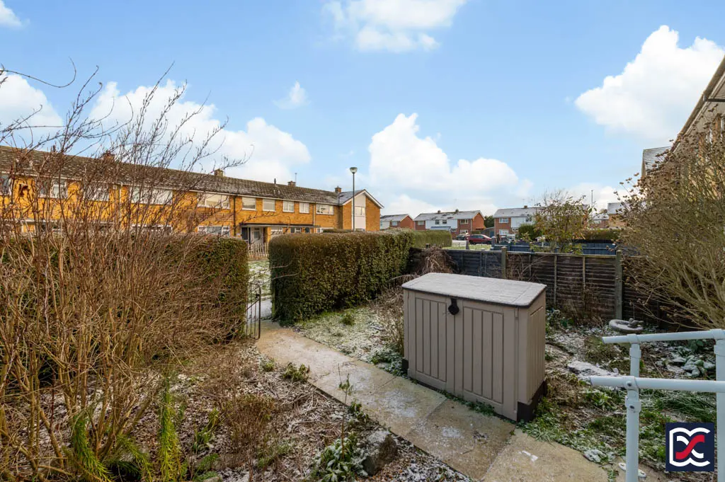 The enclosed rear garden is accessed from the communal parking area via a close-boarded gate. Designed for low maintenance, it is largely paved with patio slabs and includes raised perimeter planters together with a substantial timber shed, suitable for storage or potting. The garden can also be reached directly from the house via double-glazed French doors from the conservatory and a part-glazed door from the utility.