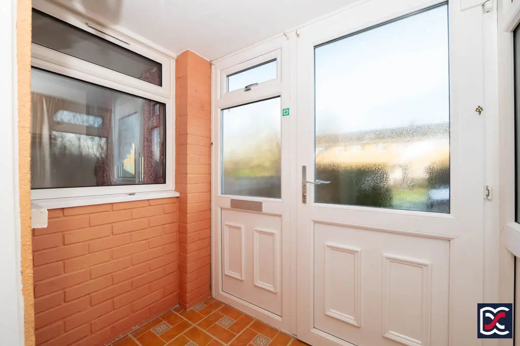 A part-glazed, panelled front door with matching sidelights opens into the entrance porch. The space is finished with sheet vinyl flooring and a mix of painted render and brick walls. A further internal, double-glazed, two-panel door leads through to the main entrance hall. Lighting is provided by a traditional coach-style wall light.