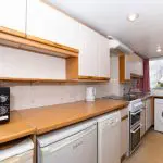 Arranged in a practical galley layout, the kitchen is fitted with a range of base and wall units, incorporating a stainless-steel sink with chrome mixer tap. A three-light window overlooks the front aspect, providing natural light. Wall finishes comprise a combination of ceramic tiling and painted brickwork, with sheet vinyl flooring continuing through from the dining area. Ceiling-mounted recessed spotlights provide lighting. There is space for a washing machine, freestanding cooker, slimline dishwasher and a fridge/freezer.