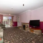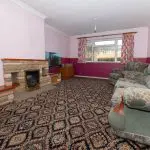 The dual-aspect sitting room is arranged around a central fireplace with a stone surround and an open-flame gas fire. Natural light is provided by a four-light window to the front and sliding double-glazed doors opening through to the conservatory. The room is finished with patterned cut-pile carpet and two-tone emulsion over embossed lining paper to the walls.