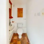 Located to the rear of the property, the lobby/cloakroom benefits from a casement window providing natural light. The space is finished with sheet vinyl flooring and neutral wall finishes, and is fitted with a close-coupled WC and wall-mounted ceramic wash hand basin, with an electric water heater above.