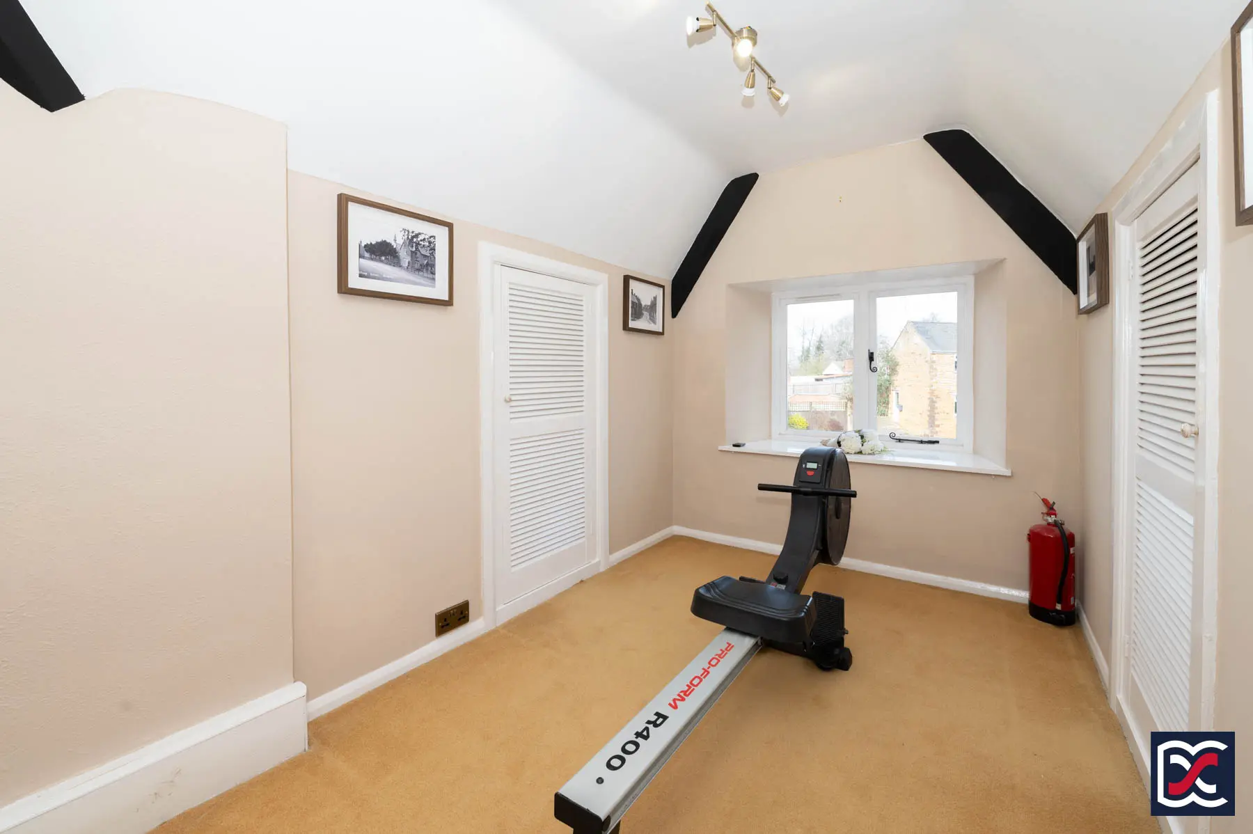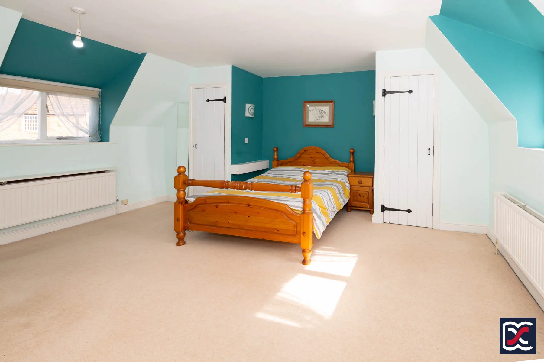 The first-floor landing is a large, partly vaulted space with natural light from front and rear windows and featuring exposed hip and purlin roof timbers. Two eaves cupboards with louvred doors are set to the front, providing useful additional storage.