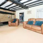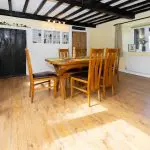 Centrally positioned within the house, the dining room is a well-proportioned space, with dual aspect windows. A full-height glazed door, with matching side panel, brings in additional natural light and opens directly onto the patio and rear garden, lending itself well to entertaining and outdoor dining. The room retains period character, with exposed chamfered ceiling beams and a full-width inglenook fireplace opening. Timber flooring is fitted throughout, and there is also an attractive glazed display cabinet with panelling below. An oak door with Suffolk latch and T-hinges opens to cellar with spiral stone steps, while a stripped pine panelled door returns to the entrance hall.