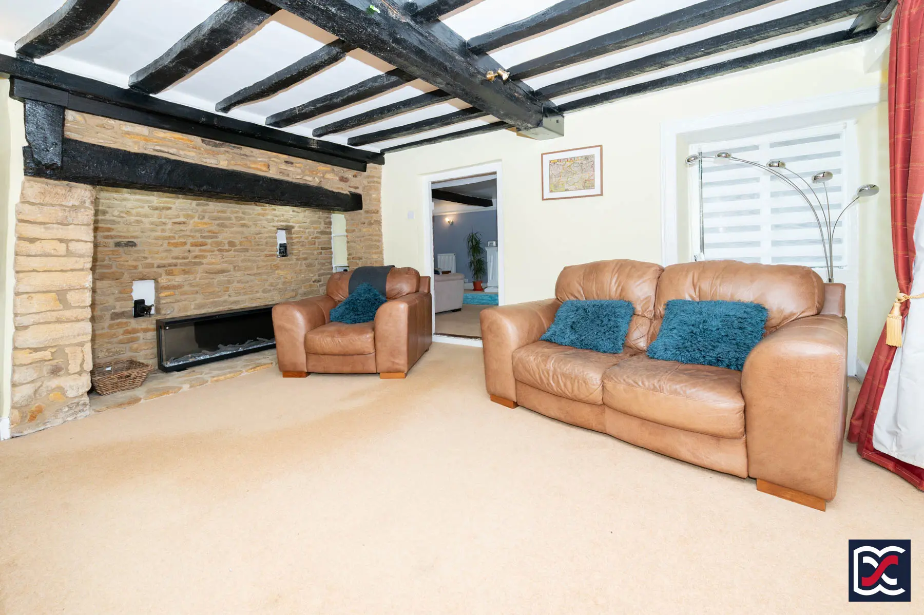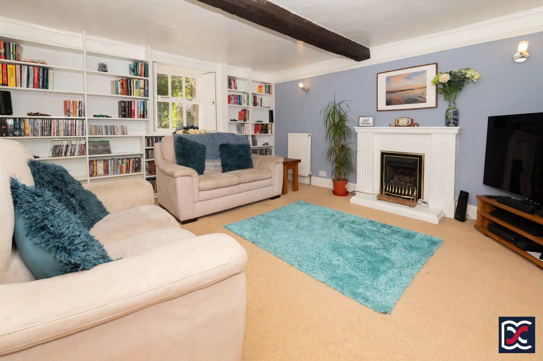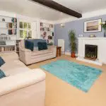 Located to the rear right-hand side of the house, the lounge is a dual-aspect room with deep-silled windows, some retaining original panelled shutters. A chamfered ceiling beam reflects the age and character of the building, while the walls are neutrally decorated and finished with profiled picture rails. Full-height shelving lines the rear wall, and the room is fitted with cut-pile carpet. A classically styled fireplace surround with open-flame gas fire is set to one wall.