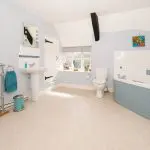 Set to the rear of the house, the Jack and Jill bathroom has a two-unit casement dormer window and partly vaulted ceilings. The suite comprises a shower cubicle, close-coupled WC and pedestal wash hand basin with chrome mixer tap, with timber-effect laminate flooring.