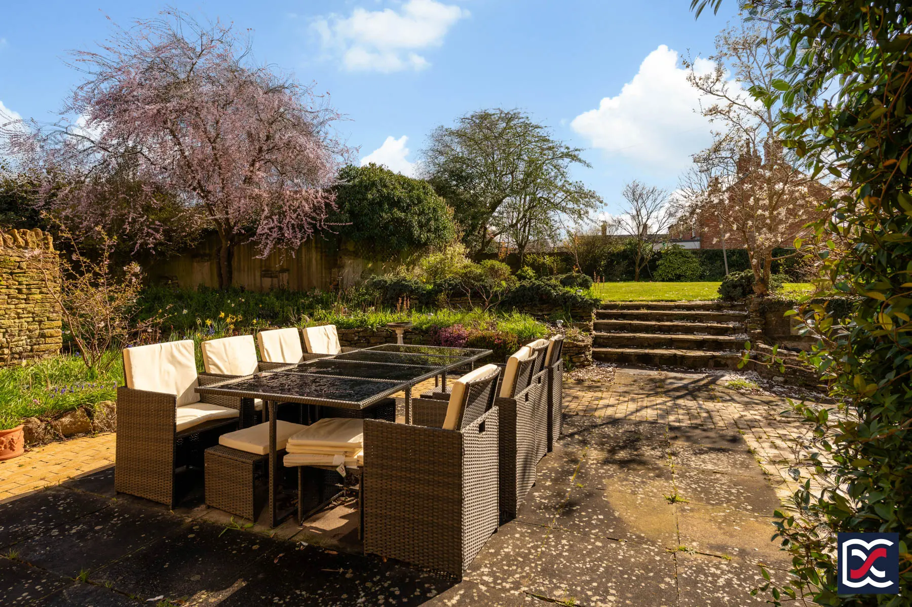 The south-facing rear garden is arranged over three levels. Immediately to the rear of the house is a substantial patio, laid in slab paving and buff brick, with a central seating area and raised stone planters. Stone steps rise from here to the main lawned garden, where established borders and mature perimeter trees, including cherry and holly, give privacy and enclosure. Further steps descend from the patio to a more sheltered area with brick retaining walls and an additional hardstanding seating area.