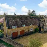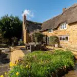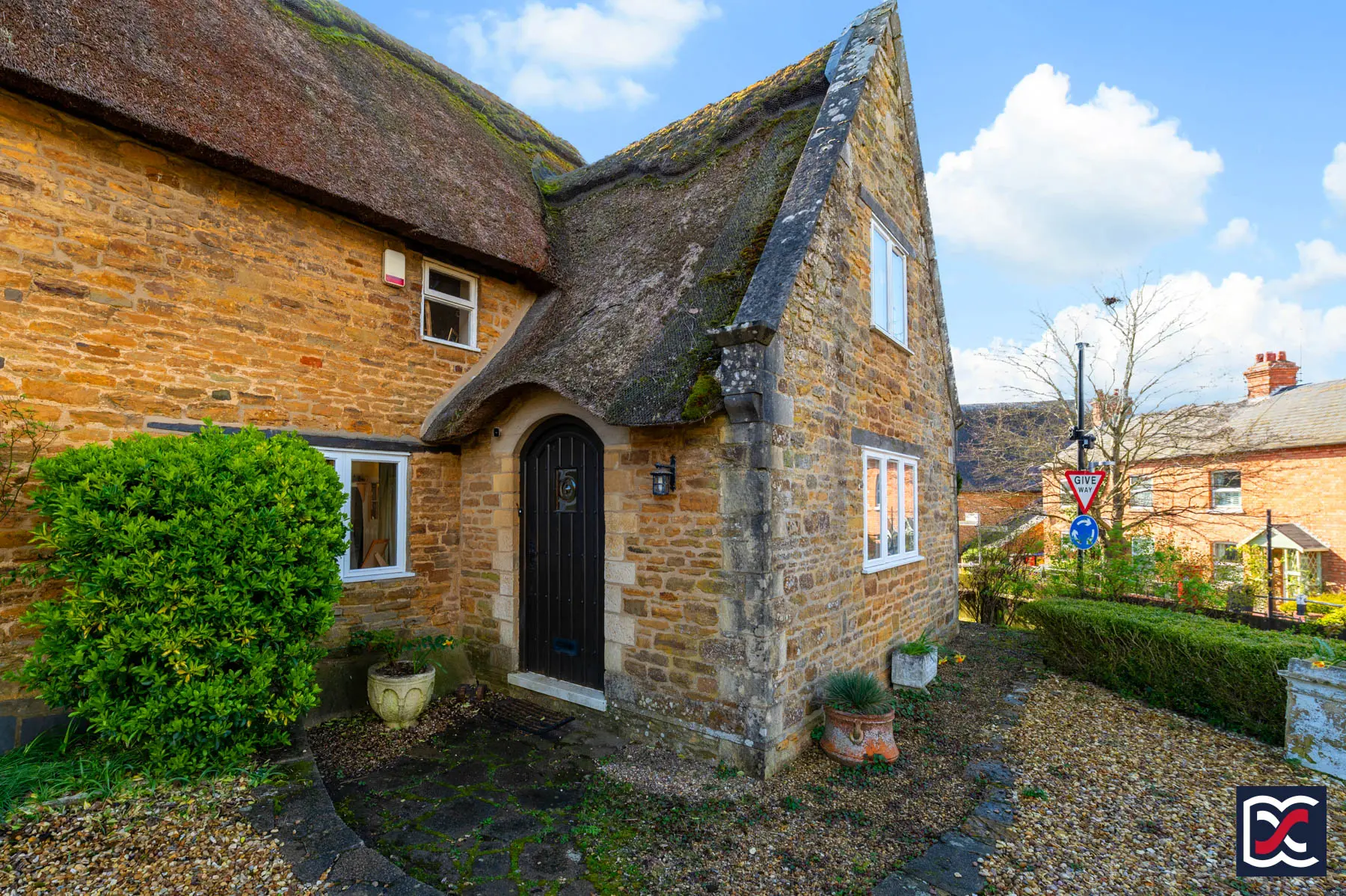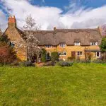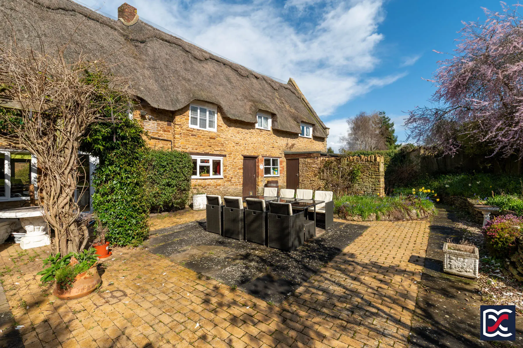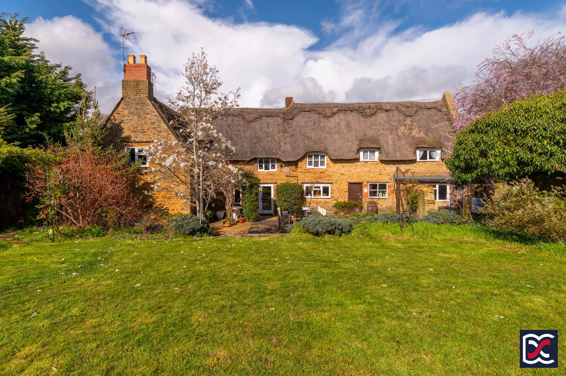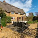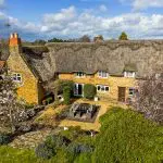 Constructed of coursed stone beneath steeply pitched thatched roofs, the property has gabled elevations, eyebrow dormers and surviving stone-mullioned windows. Internally, the accommodation retains period detailing, including exposed beams, trusses, shutters and original joinery.