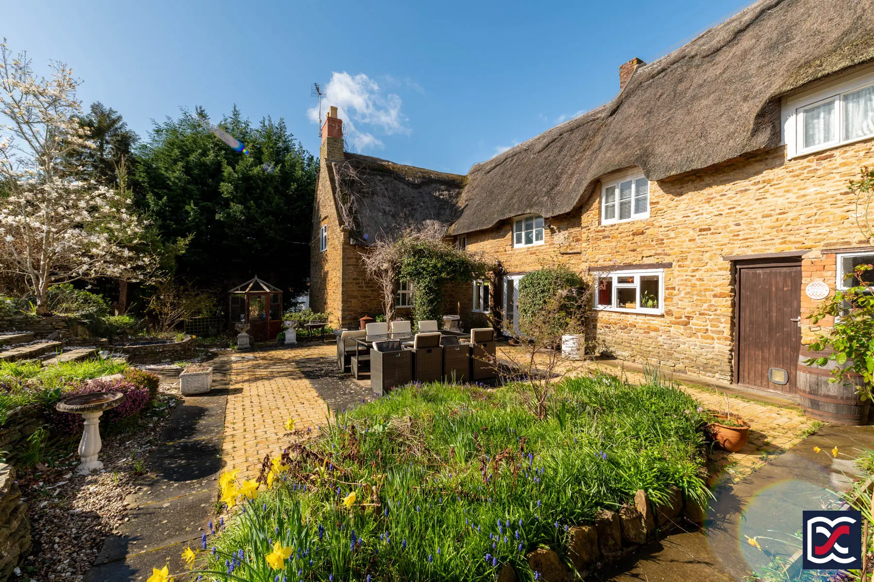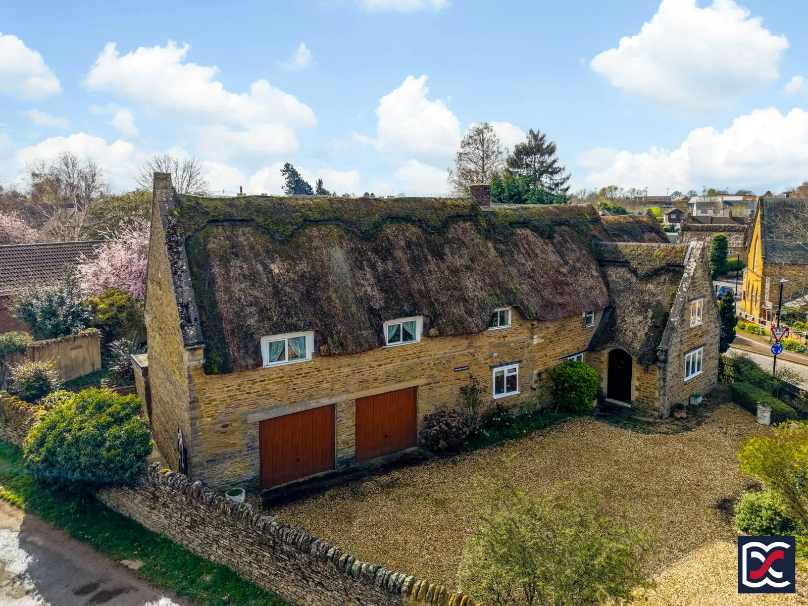 Set behind limestone and brick boundary walls, the property is approached via gated vehicular access from Barlow Lane, leading to a gravel driveway with ample parking. The attractive front elevation incorporates eyebrow thatched dormers and a gable-fronted two-storey porch. The front garden areas are arranged over a series of tiers, with raised beds planted with privet hedging, roses and mixed perennials.