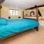 A double room with a partly vaulted ceiling, finished with white-painted timber boarding to the apex. Windows to two elevations include a timber casement to the rear gable and an original stone-mullioned side window with leaded lights. The room also includes a recessed niche providing useful shelving and storage.