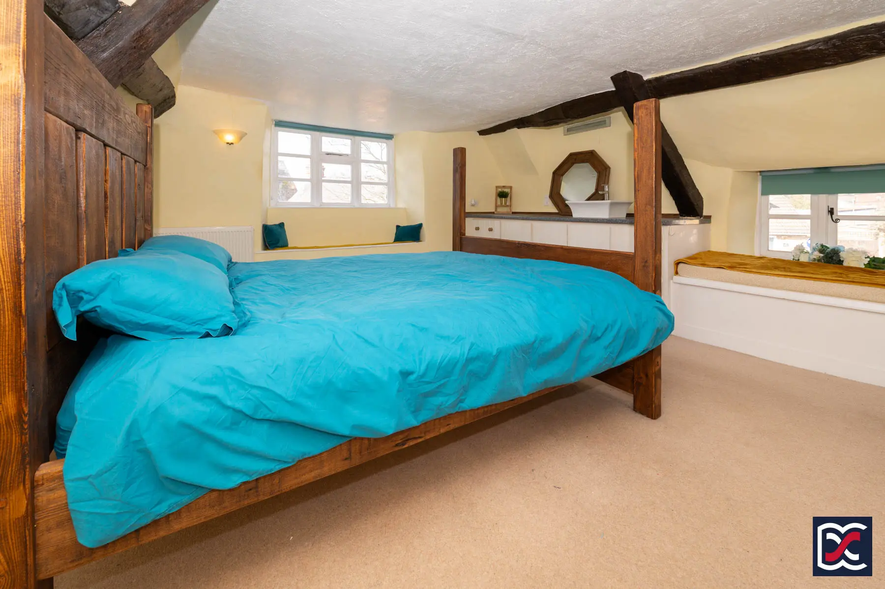 A generously proportioned room with partly vaulted ceilings and exposed original trusses and purlins. A three-unit gable window and front-facing dormer bring natural light. The room includes a fitted dressing unit with inset wash basin and two walk-in wardrobes with hanging rails and shelving behind traditional plank doors.