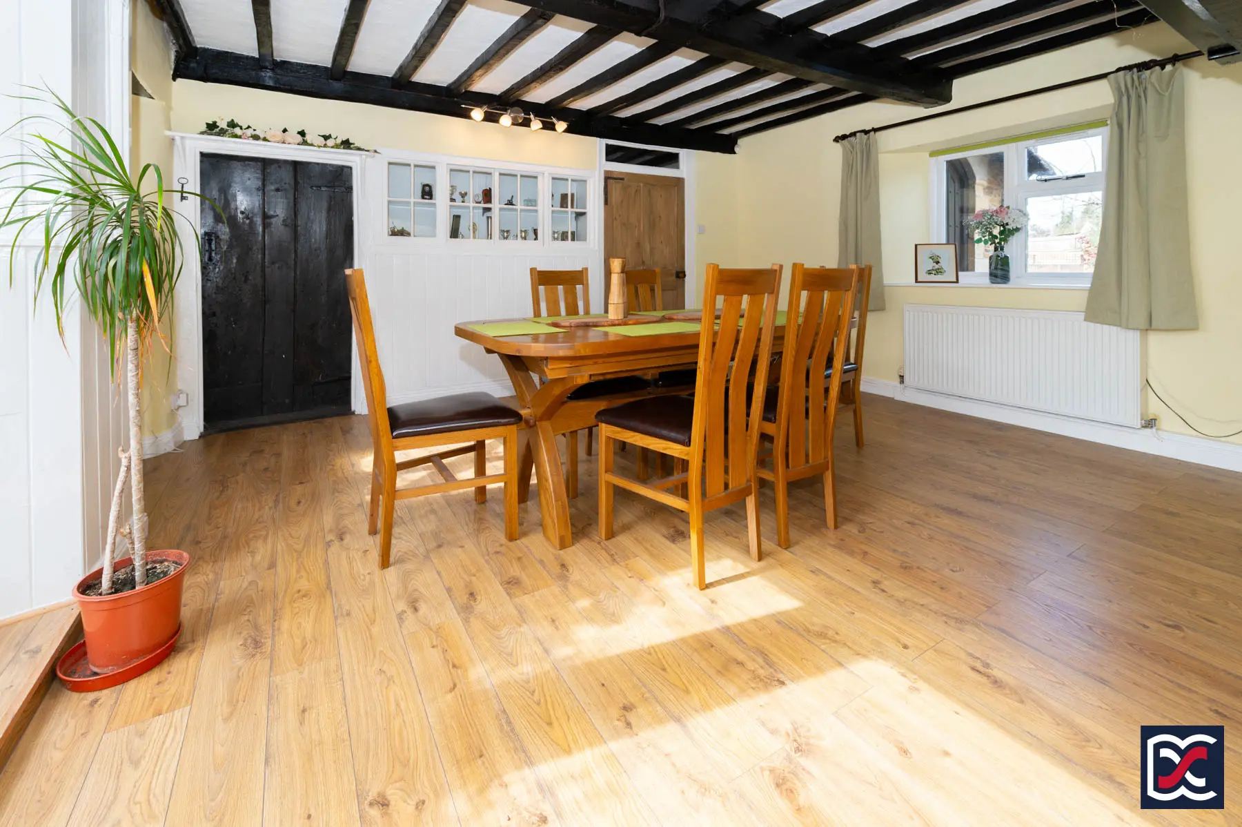 The entrance hall forms a welcoming central space with natural light from a three-unit window to the front aspect. Pine doors open to the dining room, drawing room and cloakroom and exposed oak beams contribute to the period character. A useful understairs cupboard with traditional ledged and braced door provides good storage.