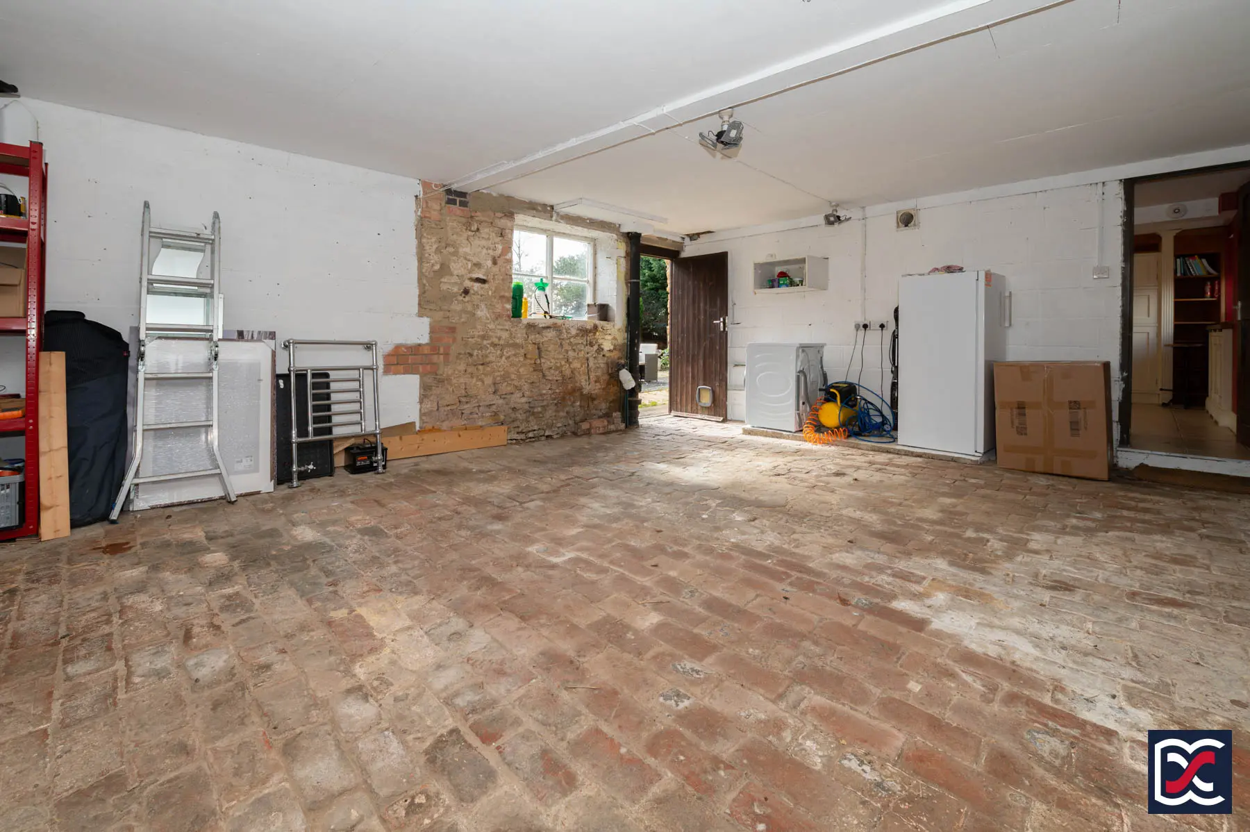 The integral double garage has two up-and-over vehicle doors and separate pedestrian access from the rear garden via a ledged and braced door. A two-part rear window provides natural light, and power, lighting and plumbing for a washing machine are connected. In addition to vehicular parking, there is space for storage, shelving and workshop use. A two-panel door connects directly to the kitchen / breakfast room.