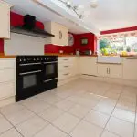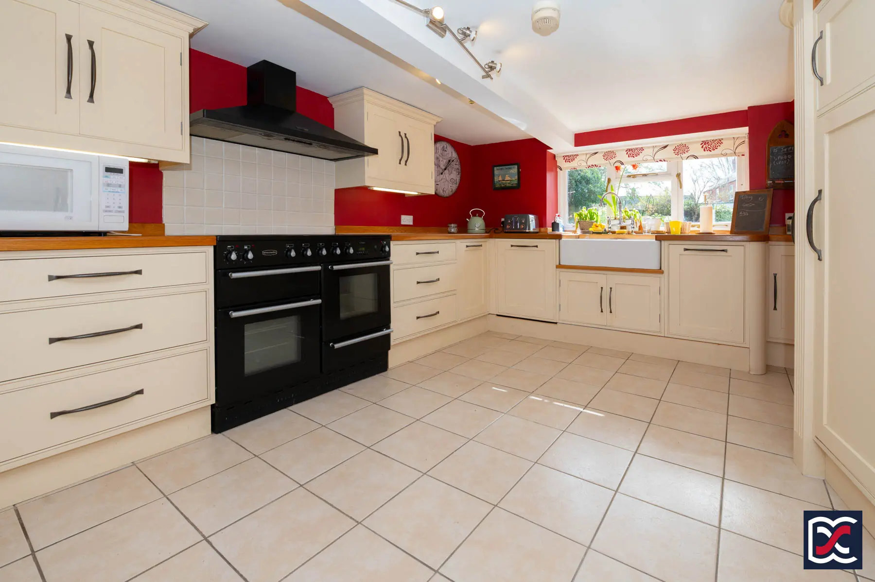 A dual-aspect room with casement windows to the front and rear, the kitchen / breakfast room is fitted with an extensive range of bespoke solid timber Shaker-style base and wall units with cream-painted fronts, solid timber work surfaces and matching upstands. The floor is laid with marble-effect ceramic tiling, and a large two-bowl Belfast sink with chrome mixer tap is set beneath the rear south-facing window, overlooking the garden. Integrated appliances include a Rangemaster with five-burner induction hob, grill and double electric oven, together with an extractor hood above, Bosch dishwasher and fridge. There is also space for a table and chairs for informal dining.