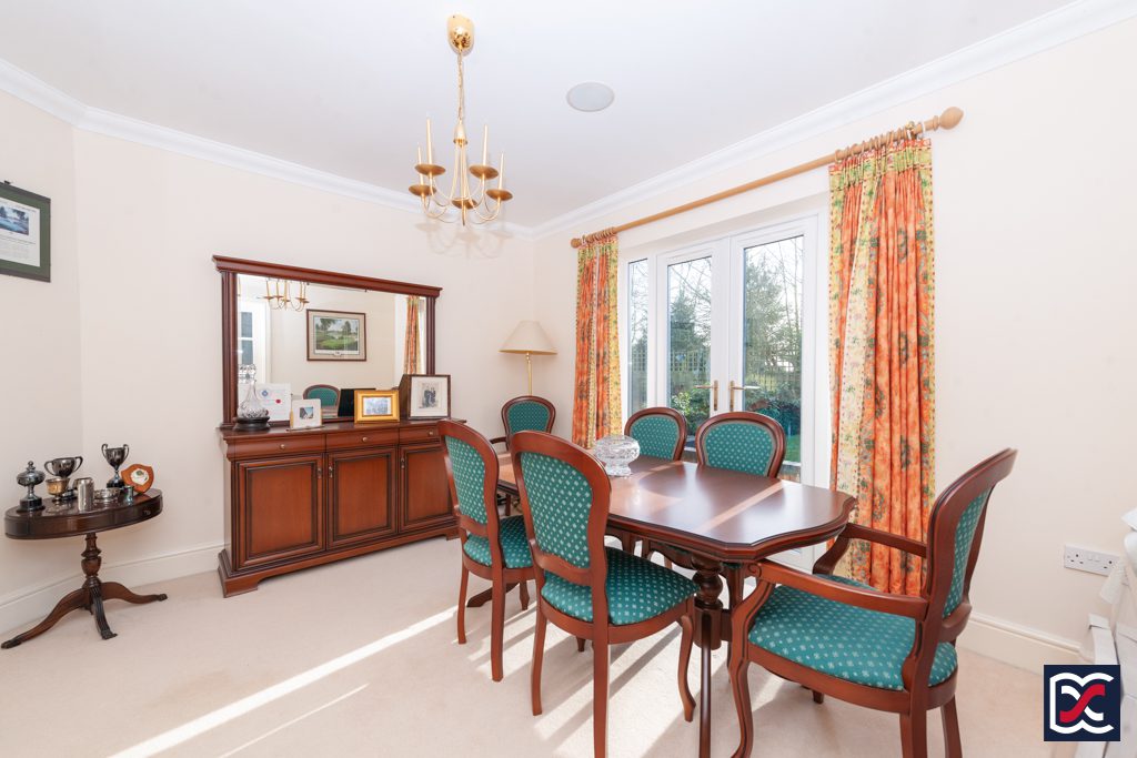 The dining room benefits from a set of French doors with sidelights opening onto the patio area, providing south facing sunlight and views of the rear garden. Floors are finished with plush, cut-pile carpet and there is space for a large dining table and chairs. Glazed doors open to the Sitting Room.