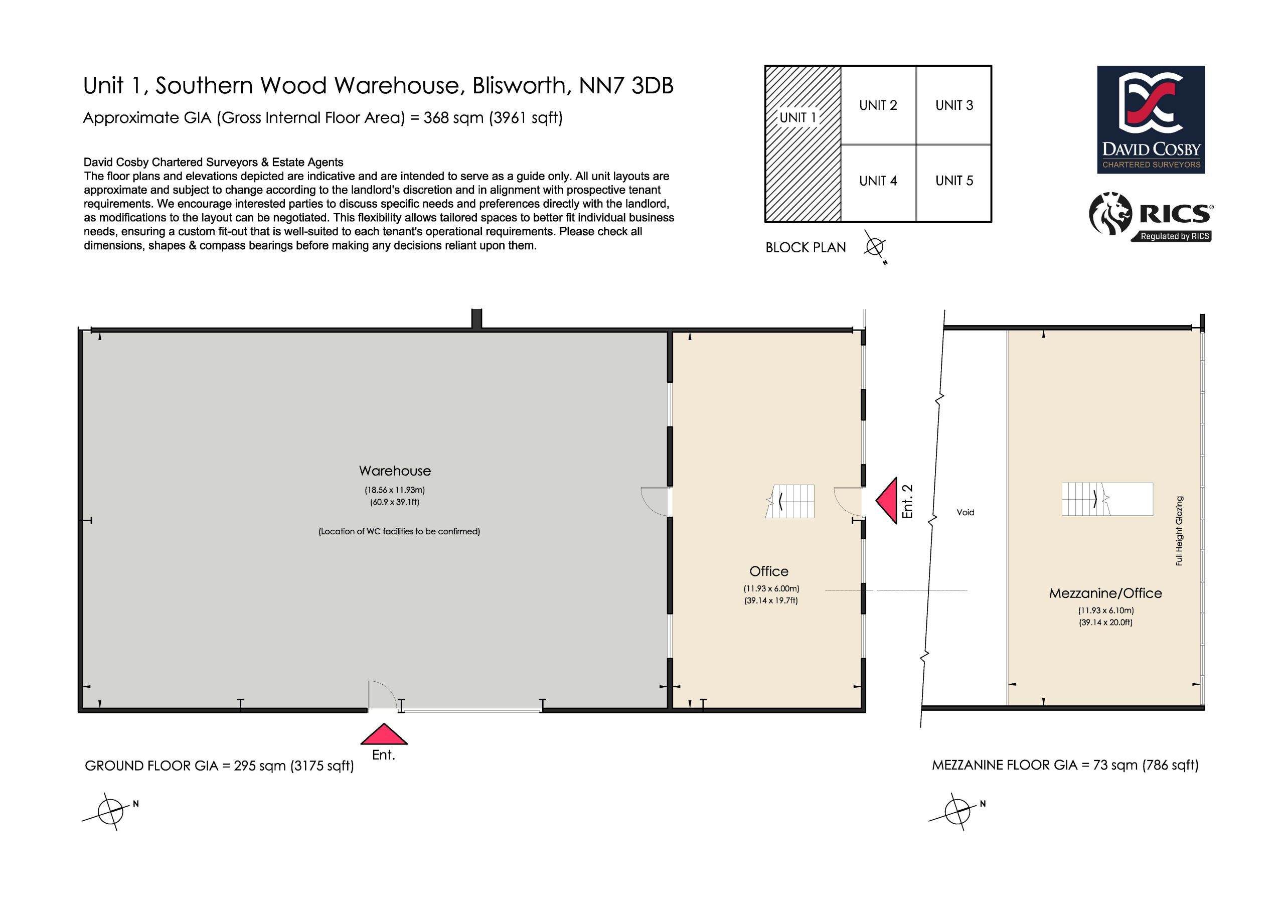 Unit One, Southern Wood Warehouse, is a newly constructed high bay industrial unit nearing completion, with flexible internal layout options to align with prospective tenant requirements (subject to landlord’s discretion). The property is situated within the idyllic rural landscape of Blisworth and has attractive far reaching countryside views from full-height glazing to the first-floor office space. This spacious unit provides scope for a dynamic business to flourish and supports an array of storage or business-specific needs. Accommodation at ground floor extends to a GIA of 3175 sqft with large warehouse space fitted with overhead sectional door and WC facilities. The first-floor mezzanine office space is currently designed to provide a GIA of 786 sqft.